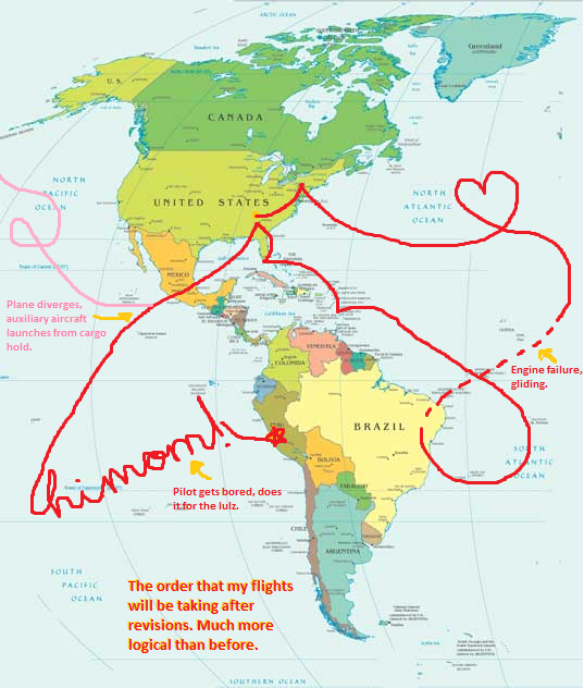So since he's out for a while, trying his damnedest to suffer heatstroke, I have a bit of time to begin my log of this last day in the States. I will begin with a complaint. According to the e-mail I received from TnCIS, our flights have been changed over night, and they make zero sense now. I have another artistic representation for you that illustrate the differences between the original flight plan and the new, improved flight plan.