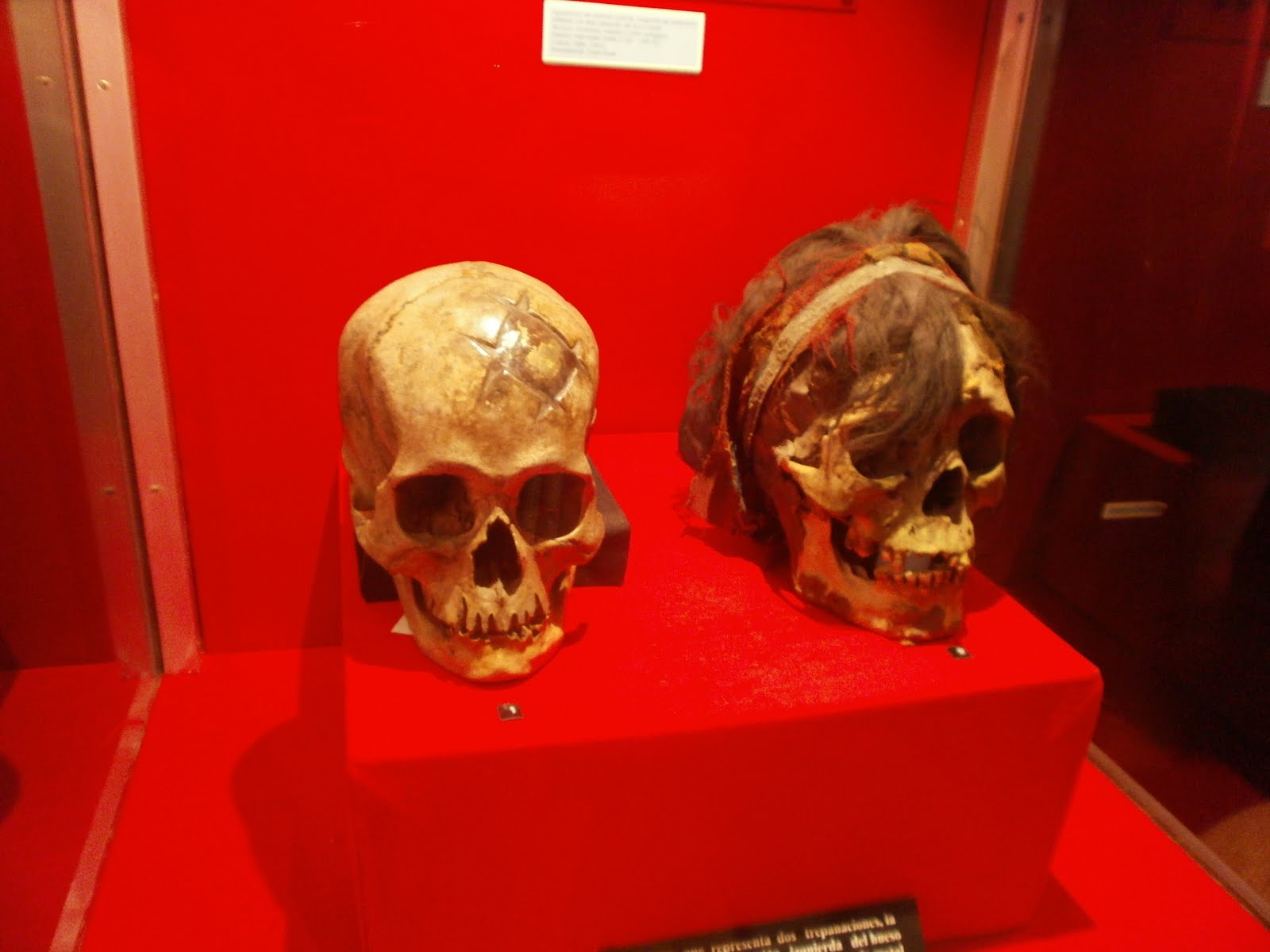 A pair of trepinated skulls. Look closely at the one on the left---his trepination is closed over with a GOLD PLATE. Yes, skin grew back over it. |