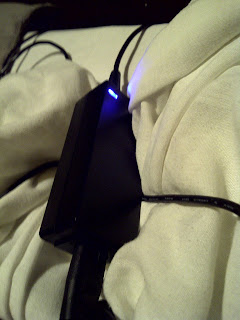I plugged it in and went to the bathroom, when I returned, I noticed the screen was dim. Odd, I thought, but not impossible. This laptop is known for flights of screen dimming and brightening fantasy. I checked the power meter. No dice. It wasn't charging. I checked the laptop charger. The normally bright blue light on the power brick that indicates it has electricity surging through it was... off. No other colour... just unlit. Period.