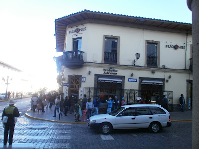 I awoke at about 1PM, still feeling good (the altitude doesn't seem to be affecting me at all. I haven't had any shortness of breath or headaches like some people have), and left for lunch. We went to an Italian restaurant that's only a few blocks away called the Trattoria Adriono. It was DELICIOUS. I had the fettucine alfredo and my companion, Hillary, had the gnocchi. It was the best Italian food I've ever had, I believe. And it was in Peru. Here is the restaurant. It's quite cute.