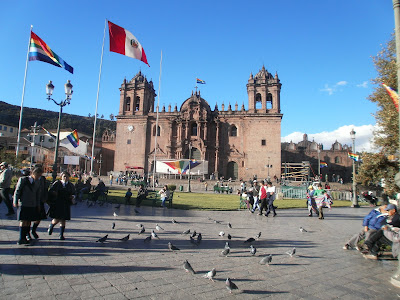 A view of the Plaza de Armas, the cathedral and the Andean skyline beyond as viewed from the top of a pedestrian-only road nearby. |